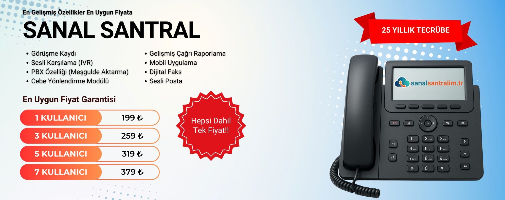 Sanal santral hizmetimizi tüm gelişmiş özellikleri ile tek bir fiyata sunuyoruz; ekstra ücret yok, gizli maliyet yok. Görüşme kaydı, IVR sesli karşılama, PBX aktarma özellikleri, cebe yönlendirme, gelişmiş çağrı raporlama, mobil uygulama, dijital faks ve sesli posta dahil tüm çözümlerle işletmenize eksiksiz bir iletişim altyapısı sağlıyoruz. Üstelik Profesyonel Seslendirme anonsu hediye!